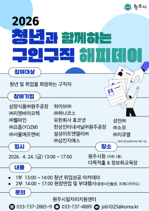 사진 확대보기(function() {.each((\'.ntt_cn_container\'), function(idx, tg) {(this).html((this).html().autoLink({ target: "_blank" }));});});2026년 4월 2차 구인구직 해피데이 채용행사에 참여할 구직자를 모집을 공고하오니 많은 관심과 참여 부탁드립니다.※ 4월행사부터는 접수방법을 현장접수로만 진행합니다. 이점 착오없으시기 바랍니다.