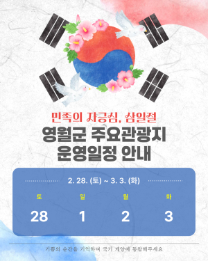 사진 확대보기사진 확대보기사진 확대보기삼일절 연휴(2.28.~3.3.) 영월군 주요 관광지 운영일정을 아래와 같이 안내드리오니, 영월군 방문에 참고하시기 바랍니다.[출처 : 영월군청 -시정소식-]