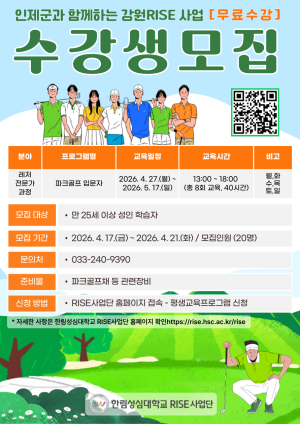 [무료] 인제군 파크골프 입문자 수강생 모집 안내 안녕하세요! 푸른 잔디 위에서 즐거운 건강 라이프, 파크골프의 세계로 여러분을 초대합니다. 인제군과 한림성심대학교가 함께하는 이번 교육은 전액 무료로 진행됩니다. 1. 과정명:파크골프 입문자 과정2. 교육기간:2026. 4. 27.(월) ~ 5. 17.(일)3. 교육시간:13:00 ~ 18:00 (총 8회, 40시간)4. 대상:만 25세 이상 성인 파크골프채 소유자 (20명)5. 접수기간:4. 17.(금) ~ 4. 21.(화)까지6. 신청방법:한림성심대학교 RISE 사업단 홈페이지 접수( https://rise.hsc.ac.kr/rise)7. 문의:033-240-9390[출처 :인제군청 -시정소식-]