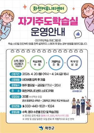 학습스타일 진단부터 나만의 공부방법 탐색까지!화천커뮤니티센터 자기주도학습 프로그램에 참여해보세요.■ 모집기간 : 2026. 4. 20.(월) 9시 ~ 4. 24.(금) 18시