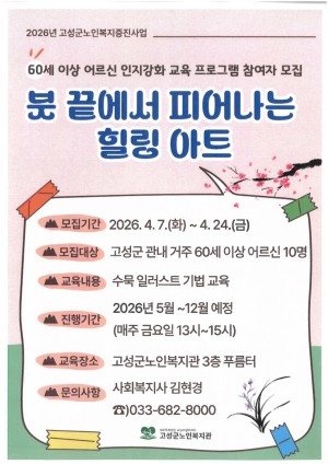 60세 이상 어르신 인지강화 교육 프로그램 참여자 모집『붓끝에서 피어나는 힐링아트 』 ㅣ모집기간ㅣ 2026. 4. 7. (화) ~ 4. 24.(금)ㅣ모집대상ㅣ 고성군 관내 거주 60세 이상 어르신 10명ㅣ교육내용ㅣ 수묵 일러스트 기법 교육ㅣ진행기간ㅣ 2026년 5월 ~ 12월 예정(매주 금요일 13시~15시)ㅣ교육장소ㅣ 고성군노인복지관 3층 푸름터ㅣ교육문의ㅣ 고성군노인복지관 033-682-8000 [출처 : 고성군청 -시정소식-]