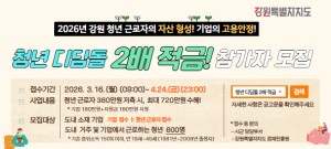 강원특별자치도에서는 도내 청년근로자의 경제적 자립과 자산형성을, 기업에게는 고용안정과 장기재직을 촉진하기 위한 을 시행하오니 청년 여러분의 많은 관심과 참여 바랍니다. ▣ 사 업 명 : 2026년 청년 디딤돌 2배 적금 지원사업▣ 신청기간 : (당초) 2026. 3. 16.(월) 09:00 ~ 4. 10.(금) 23:00 -> (변경) 2026. 3. 16.(월) 09:00 ~ 4. 24.(금) 23:00▣ 신청방법 - 온라인신청 : 청년 디딤돌 2배 적금 홈페이지(https://double.gwwell.kr/youth)▣ 선정자 발표 : 2026. 5월중▣ 지원대상 - 근로자 : 도내 거주 및 기업에서 근로하는 중위소득 150%이하 18세~45세 이하 청년 ※ 1981년 ~ 2008년 출생자 - 기 업 : 도내 기업(사업자등록증 또는 공장등록증명서 기준)▣ 지원내용 : 자산형성 및 금융역량 강화 - 자산형성 : 청년(10) + 기업(5) + 지원금(5) 매칭 지원(총 적립금 720만원) - 금융역량강화 : 재무교육, 금융컨설팅 등▣ 문 의 : 강원특별자치도 일자리청년과 ☎ 033-249-2778 / 강원특별자치도 경제진흥원 ☎ 033-256-3274※ 자세한 사항 및 관련 서식은 붙임파일의 공고문을 확인해주시기 바랍니다.[출처 : 고성군청 -시정소식-]