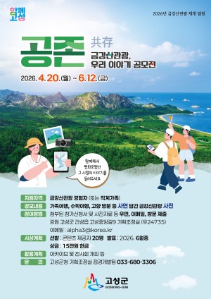 강원문화재단에서 도내 생활권 중심 문화예술교육 거점 공간 조성으로도민의 문화예술교육 접근성 향상을 위해2026 문화예술교육 기반조성지원 사업의 매징지원 공모를 추진하오니,문화예술교육에 관심있는 도내 예술단체의 많은 참여 부탁드립니다. 1. 공 모 명: 2026 문화예술교육 기반조성지원 매칭지원(민간단체) 공모2. 공모기간: 2026. 4. 2.(목)~4. 30.(목), 18:003. 접수기간: 2026. 4. 20.(월)~4. 30.(목), 18:004. 접수방법: 지방보조금관리시스템 (www.losims.go.kr)을 통한 온라인 신청5. 지원규모: 최대 15,000,000원(단체 교부) [출처 : 고성군청 -시정소식-]