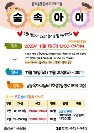 사진확대보기2025년 꿈키움통합복지프로그램 [숲속 아이 - 오감 놀이] 프로그램에 여러분을…