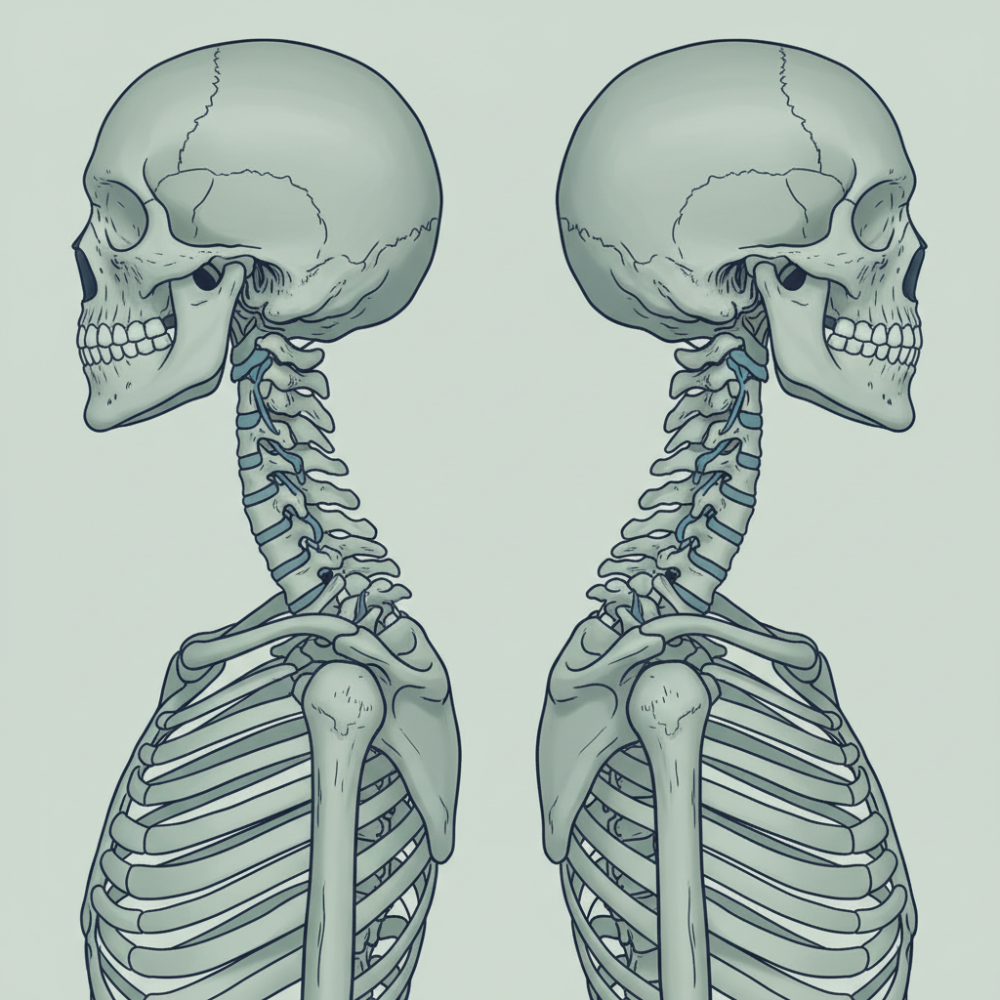 운동 요법: 턱 당기기(Chin tuck), 어깨뼈 모으기, 흉추 신전 운동 등 짧고 실용적인 루틴을 하루 여러 번 꾸준히 시행합니다 (최소 6~12주).