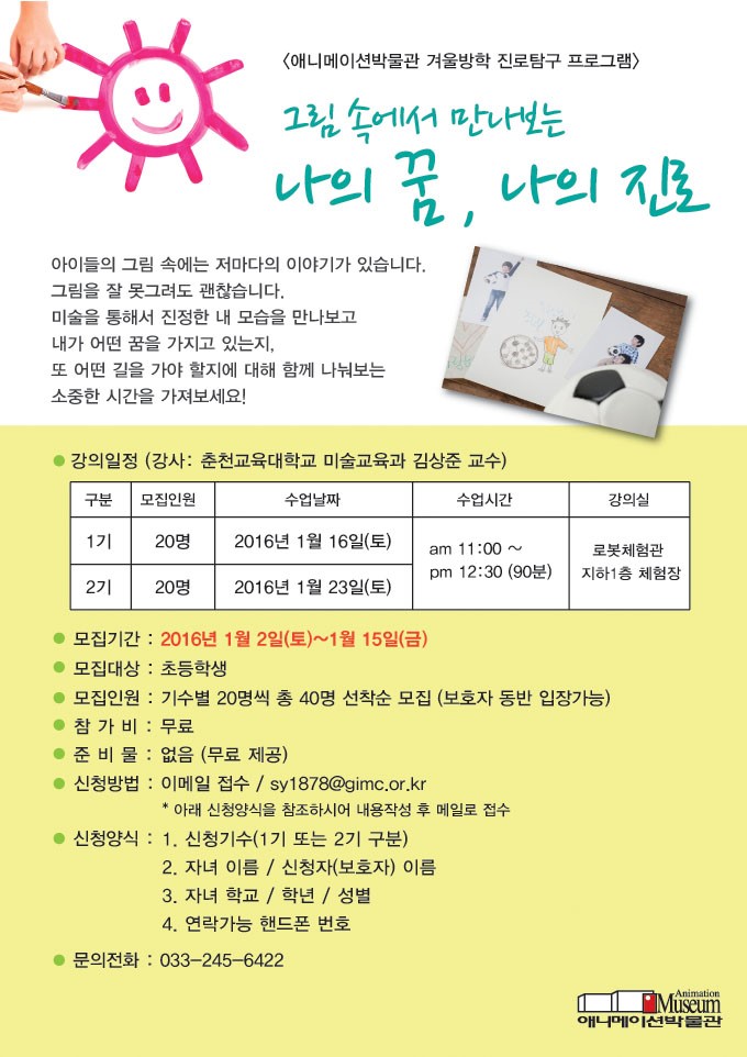 [교육/춘천시] [무료강좌] 애니메이션박물관 겨울방학 진로탐구 프로그램