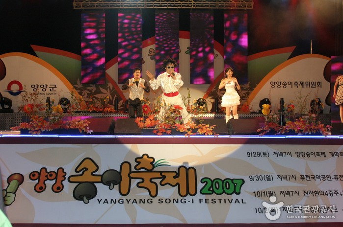 송이버섯을 사람들은 황금버섯, 숲 속의 다이아몬드, 신비에 쌓인 영물이라고 부른다. 값이 비싸 송이를 일반서민들이 맛보기란 쉽지 않다. 하지만 여인의 한복 저고리처럼 설악산의 크고 작은 봉오리들이 단풍 저고리를 입고 남하하는 가을이 되면 이곳 가을 양양에는 영물 송이의 신비를 찾는 사람들이 모여든다. 주로 가을 추석 무렵에 소나무숲 땅 위에서 발생하는 식용버섯으로 소나무 아래서 자라기 때문에 송이버섯이라는 이름이 붙었다. 대부분의 버섯이 죽은 나무에서 발아하여 기생하는데 비해 송이는 살아있는 20~60년산 소나무에만 자생한다. 향기가 독특하고 맛이 좋아 오래 전부터 식용으로 사용됐다. 남대천, 설악산의 산림욕을 즐기며 화강암 토질에서 수십 년 자란 소나무 밑 솔잎 낙엽을 뒤져 만나는 송이. 3년 연속 문화체육관광부 최우수축제로 선정되었고, <양양송이축제>는 해를 거듭할수록 많은 관광객들이 모여 들어 명실상부한 한국의 대표적 지역축제로 자리매김하고 있다.