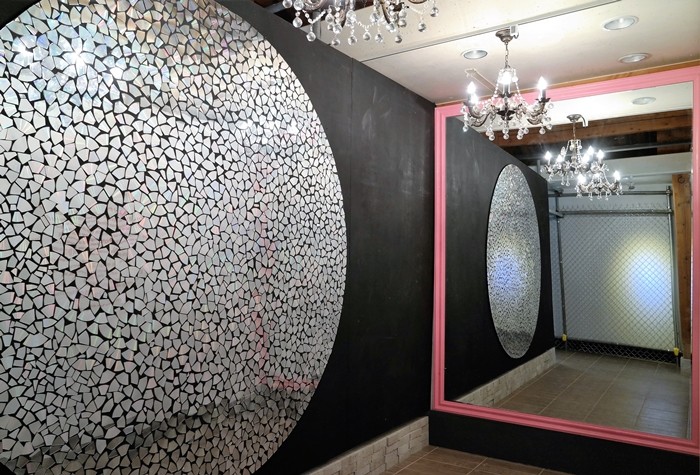 - 폐 CD 조각으로 만든 원형 조형물과 온전한 거울