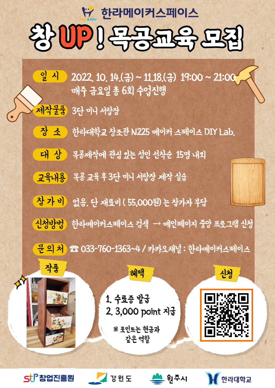 한라메이커스페이스 목공교육 참가자 모집 | 체험 | 원주시 | 2022-10-14 | 2022-11-18 |