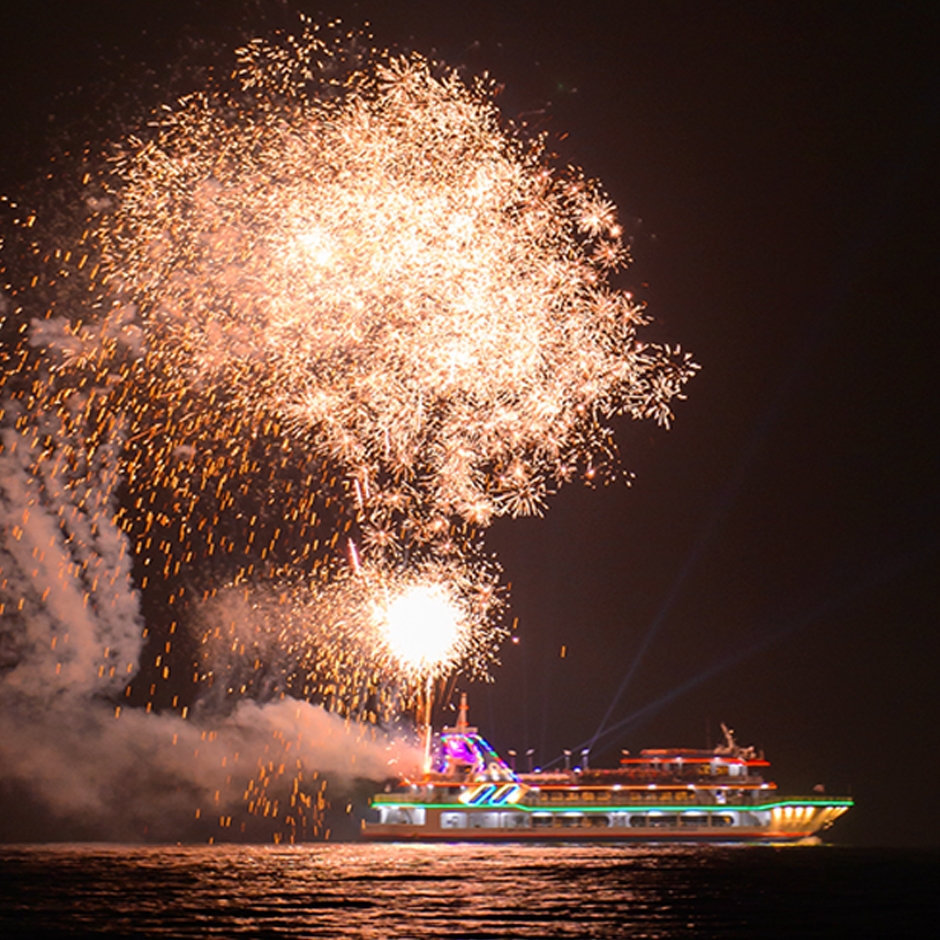 매주 금/토요일, 화려한 불꽃축제인 선상불꽃쇼는 불꽃을 바로 눈앞, 매우 가까이에서 볼 수 있다.