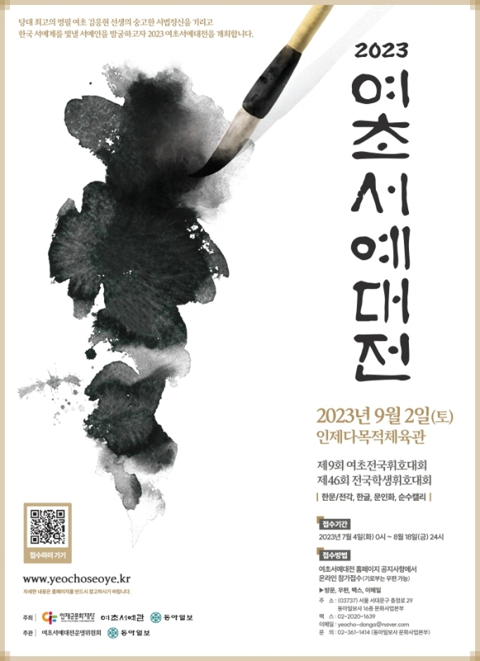 당대 최고의 명필 여초 김응현 선생의 숭고한 서법정신을 기리고 한국 서예계를 빛낸 서예인을 발굴하고자 2023 여초서예대전을 개최한다. 올해부터는 동아일보사와 인제군문화재단이 공동 주최해 더욱 확고한 공정성을 바탕으로 대회 위상과 권위를 높이고 대한민국 서예계 저변확대를 통한 발전에 기여하겠다. 또한 최근 서예계의 트렌드를 반영하고 많은 참가자가 대회에 함께 할 수 있도록 순수캘리 부문을 신설하는 한편, 전국학생휘호대회 초/중고등부 부문은 작품사진 온라인 제출 형태의 예선을 처음으로 시행한다.