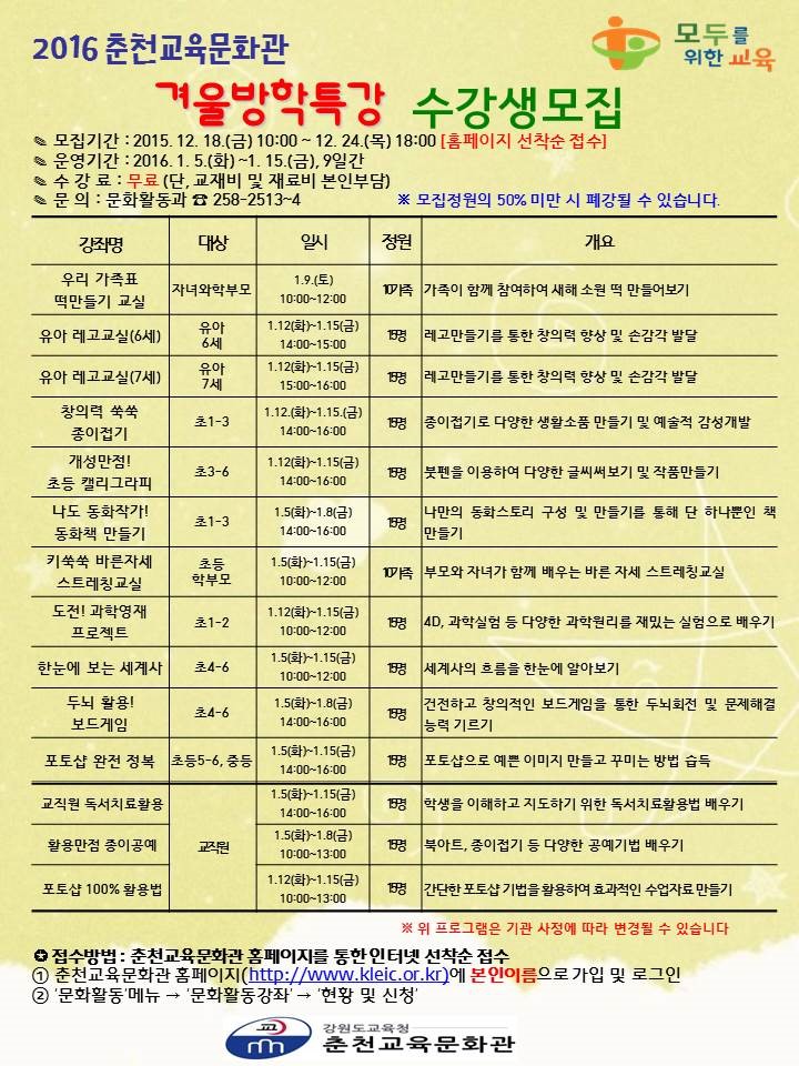 [교육/춘천시] [춘천교육문화관] 2016 겨울방학특강 수강생 모집