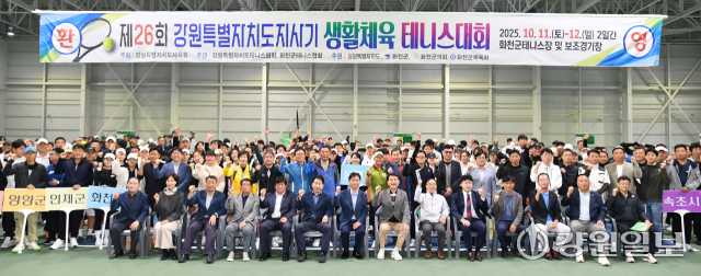 제26회 강원특별자치도지사기 생활체육 테니스 대회 개회식이 지난 11일 화천생활실내체육관에서 김진태 지사, 최문순 화천군수, 박대현 도의원, 류희상 화천군의장과 조웅희 부의장, 양희구 도체육회장, 송호관 화천군체육회장, 도내 테니스 동호인들이 참석한 가운데 열렸다.
