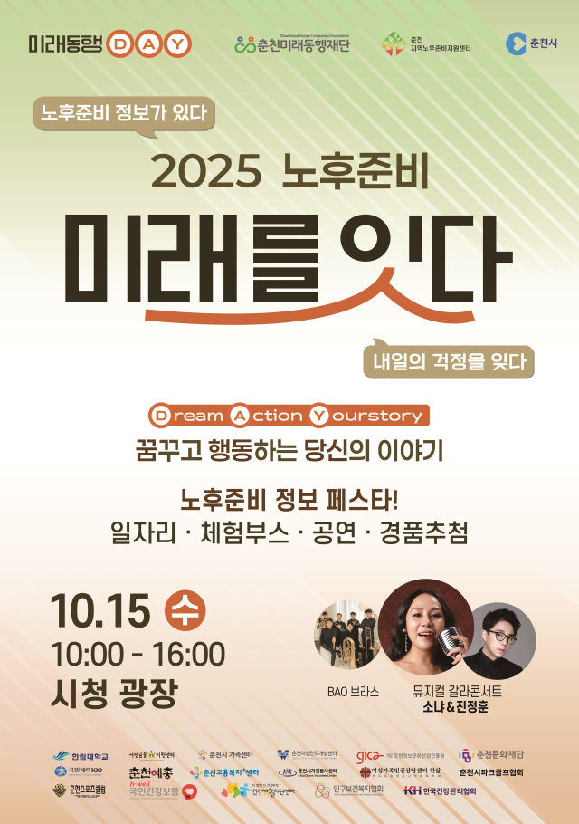 춘천미래동행재단(이사장:신용준)이 오는 15일 춘천시청 광장에서 노후 준비 정보 페스타 '2025 노후 준비 미래를 잇다'를 개최한다.