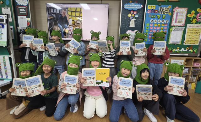 ◇횡성초교 2학년(담임교사:김하나) 학생들이 20일 교실에서 '2025 사랑의 일기 큰잔치 세계대회'에 사용될 대형 걸개그림을 제작하며 서울지역 사랑의 일기 학부모들로부터 선물받은 개구리 털모자를 쓰고 활짝 웃고 있다.