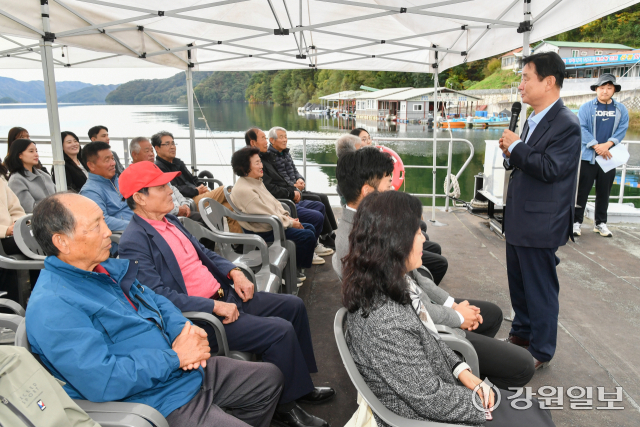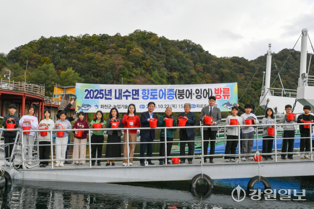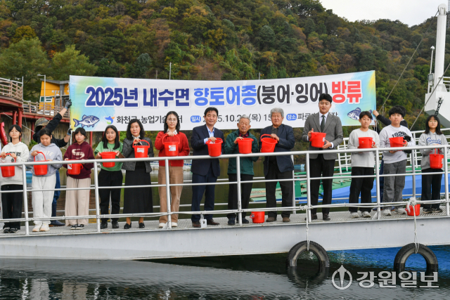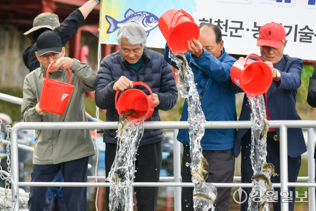 화천지역 내수면 수산자원 증식을 위한 향토어종 치어 방류행사가 23일 화천군 간동면 파로호에서 최문순 화천군수, 박대현 도의원, 이화원 화천군노인회장, 정병록 화천읍노인회장, 지역 초등학생, 화천군청 신규 공무원들이 참석한 가운데 진행했다. 이날 행사에서는 붕어와 잉어 치어 19만 마리가 방류됐다.