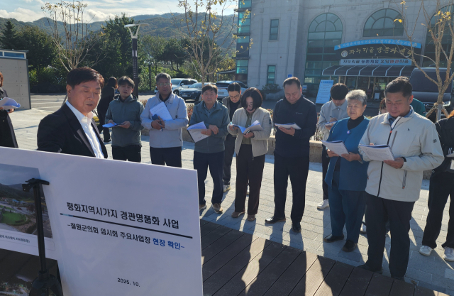 【철원】철원군의회(의장:한종문)가 23일 제308회 임시회 군정 주요사업장 현장확인을 실시했다. 군의회는 이날 마현리 민통초소 이전사업을 비롯해 와수 택시부 앞 인공폭포 설치사업, 평화지역 시가지 경관명품화 사업 등 총 6곳의 군정 주요사업장을 확인했다.