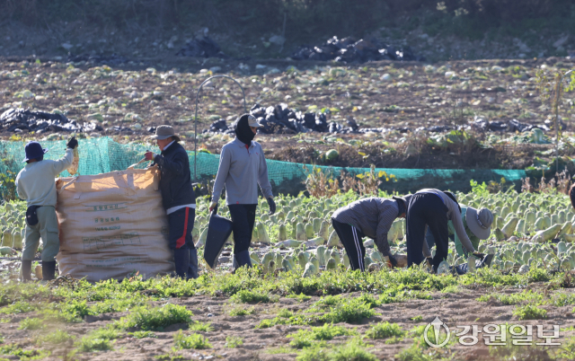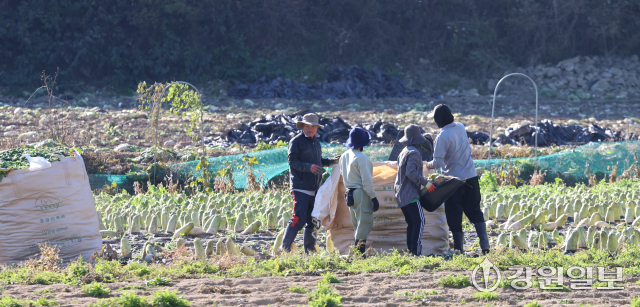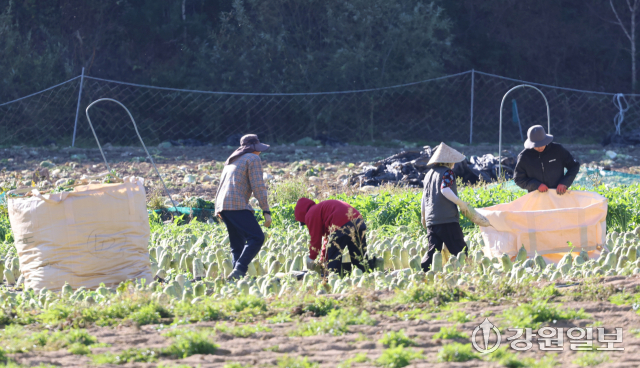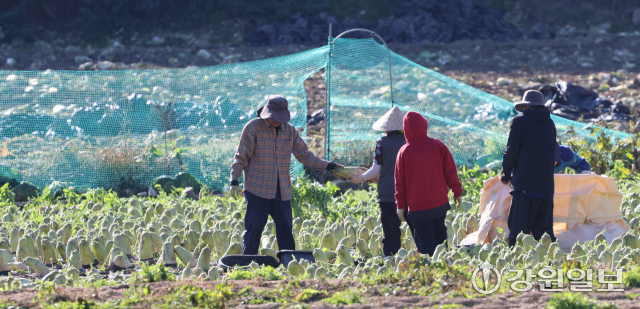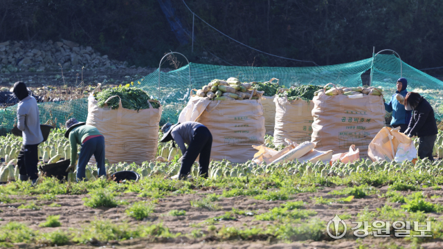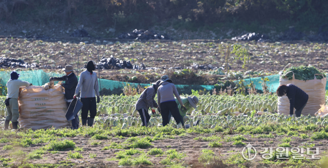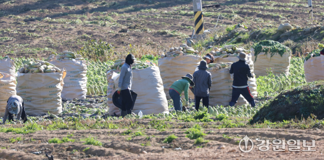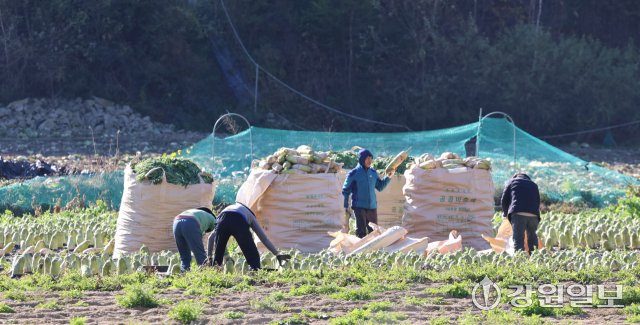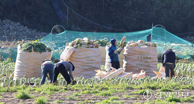 도내 산지의 아침 최저 기온이 영하 7.8도까지 떨어진 28일 강릉시 왕산면 대관령 고랭지에서 농민들이 무 수확을 서두르고 있다. 강릉=권태명기자도내 산지의 아침 최저 기온이 영하 7.8도까지 떨어진 28일 강릉시 왕산면 대관령 고랭지에서 농민들이 무 수확을 서두르고 있다. 강릉=권태명기자