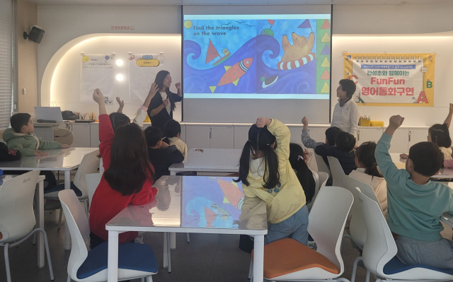 ◇고성군 간성초에서 진행 중인 영어동화지도사의 교육 모습.【고성】 고성군이 양성한 영어동화지도사 전문 인력이 지역 교육 인프라 부족 해소에 기여하며 호평을 받고 있다.