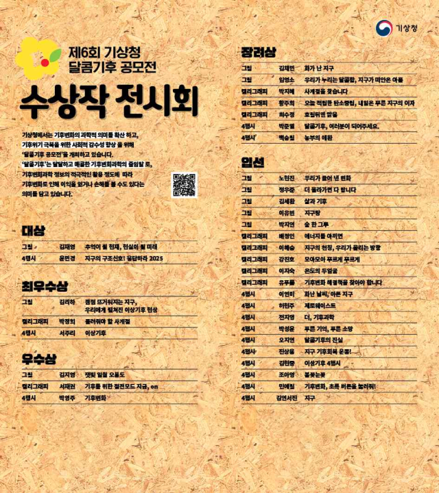 이번 전시회에는 기상청이 시상한 △‘추억이 될 현재, 현실이 될 미래’(김재영·그림 부문 대상) △‘지구의 구조신호! 응답하라 2025’(윤민경·4행시 부문 대상)를 비롯한 수상작 35점이 친환경 소재(허니콤보드)를 활용해 전시된다.