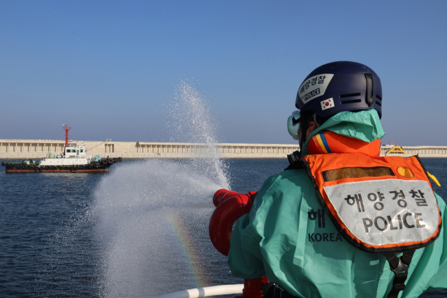 ◇해양경찰관이 소화포를 이용해 화재를 진압하고 있다.