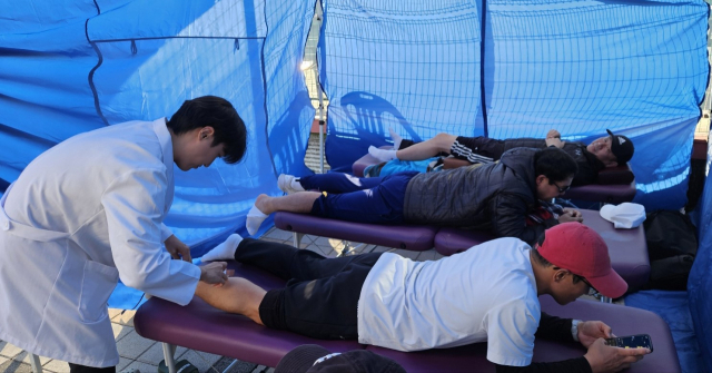 ◇지난 16일 횡성에서 열린 2025년 강원특별자치도한의사회장배 한방(BIG SHOT)테니스대회에 참가한 선수들이 대회장에 마련된 한의진료실에서 진료를 받고 있다.