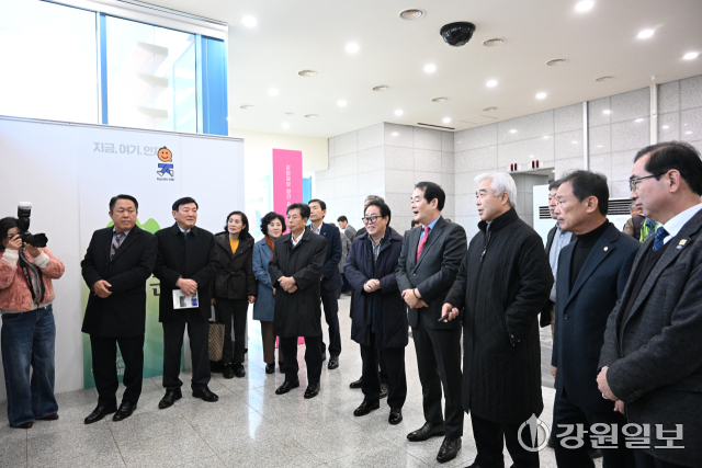 18일 인제산촌민속박물관에서 열린 '강원의 역사전-인제의 어제와 오늘' 개막식에서 내빈들이 전시를 보고 있다. 전시는 오는 23일 오후까지 이곳에서 이어진다. 신세희기자