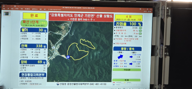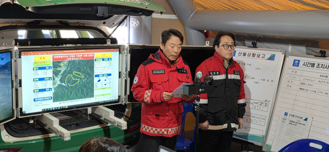 이종화 인제국유림관리소장과 최상기 인제군수가 21일 오전 10시30분 인제 기린면 산불대책본부에서 '인제 기린면 산불'의 주불진화 완료를 발표하고 있다. 인제=최영재기자