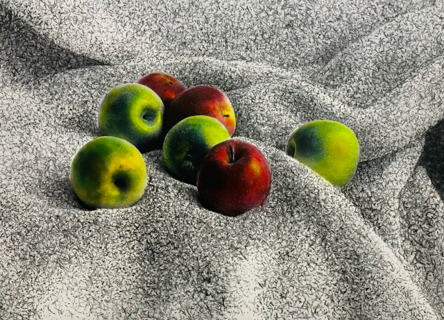 주로 회화의 기본 요소인 점, 선, 면과 사과를 오브제로 삼아 예술과 문명의 본질을 표현하고 있다.