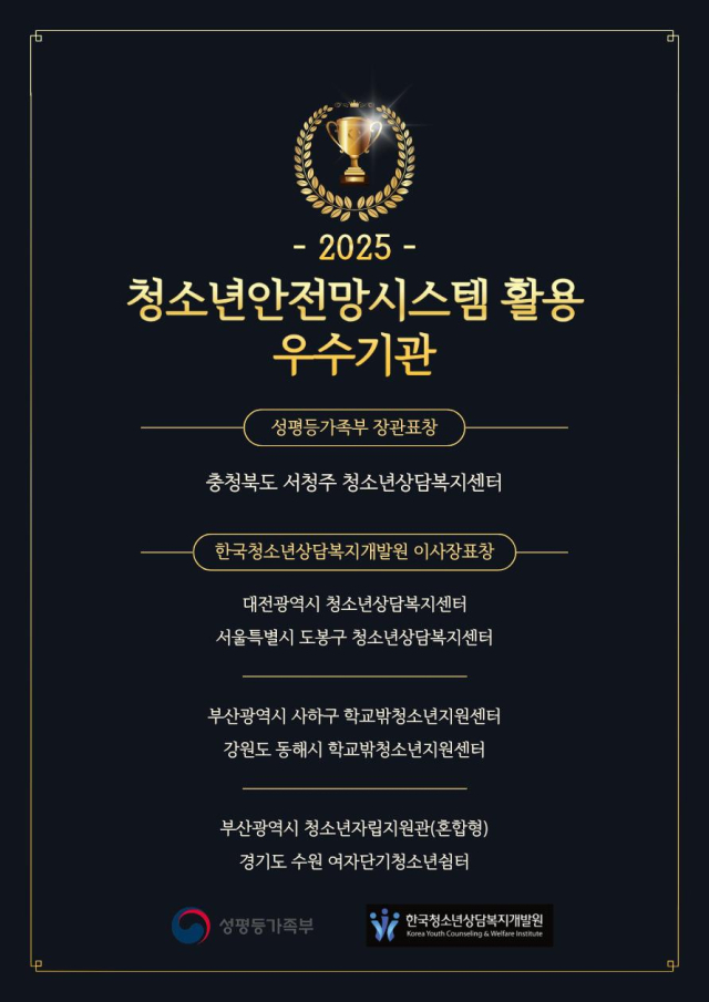 동해시학교밖청소년지원센터는 청소년 안전 확보와 지원체계 강화를 위해 안전망 시스템을 적극 활용해 왔으며, 이를 통해 우수 사례 발굴과 통합지원 연계에 기여한 점을 인정받아 우수기관 표창을 받았다.