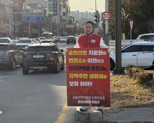 유환규 춘천시의원은 3일 중앙로터리와 후평사거리에서 송전선로 지중화 및 변전소 이전을 촉구하는 1인 시위를 펼쳤다. 이날 유 의원을 비롯해 박기영 강원특별자치도의원, 김보건 춘천시의원 등은 후평동 일대에서 송전선로 지중화 및 변전소 이전 서명 운동을 전개했다.