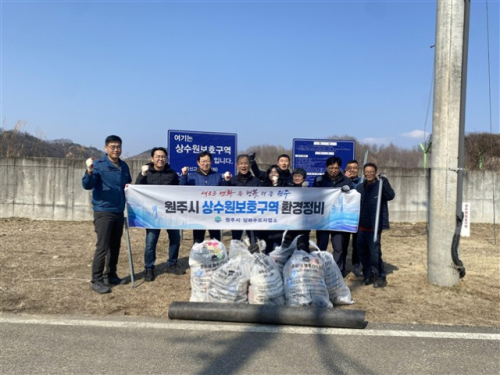 원주시상하수도사업소는 지난 12일 소초면 장양리에 있는 원주취수장 일원에서 남기은 소장과 직원 등이 참석한 가운데 상류 상수원보호구역에서 환경정비 활동을 실시했다. 이날 참가자들은 취수원인 섬강 하천 주변으로 바람에 날아오거나 물에 떠 내려온 쓰레기 총 520ℓ를 수거했다.