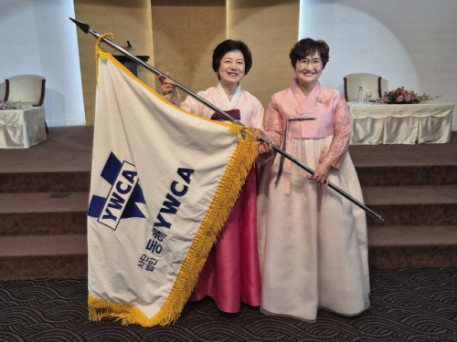 (사)동해YWCA 회장 이·취임식이 12일 뉴동해관광호텔에서 열려 김성자(왼쪽) 신임회장이 김근혜 이임회장으로부터 동해YWCA 기를 전달받고 있다.