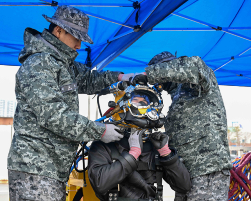 현장에 도착한 해군·해경 구조대원들은 해군·해경 2인 1개조로 구성된 구조팀을 차례로 수중에 투입했다. 표면공급잠수체계(SSDS)를 활용해 침몰 선박을 모사한 철제구조물의 내·외부 형상과 위험물을 파악하고, 가상 익수자를 모사한 인체 모형을 탐색·구조하는 훈련을 진행했다. 표면공급잠수체계는 특수 헬멧과 기체 공급 시스템을 통해 일반 스쿠버 장비보다 더 깊은 수심해서 구조작업이 가능하다.