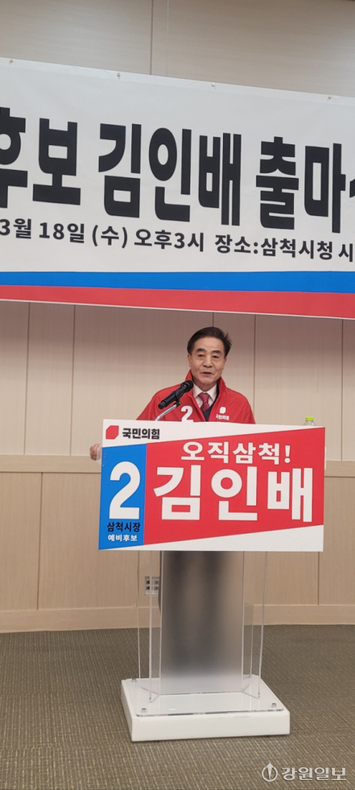 김인배 국민의힘 삼척시장 예비후보는 18일 시청 시민회의장에서 출마선언 기자회견을 통해 삼척의 산업지도를 새로 그리겠다고 밝혔다.
