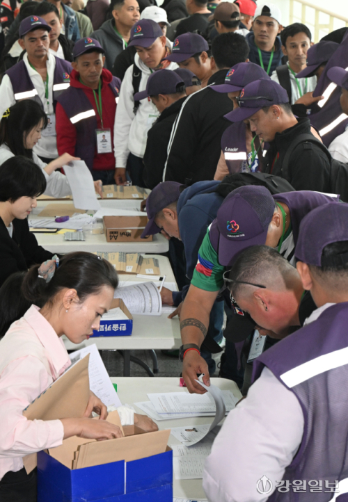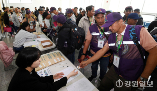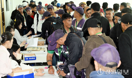 농촌지역 일손 부족을 해결하기 위해 홍천군이 올해 도내 최대규모인 1,820명의 외국인 게절근로자를 도입해 각 농가에 배치한다. 20일 1차로 입국한 외국인 계절근로자들이 홍천문화원에서 열린 입국설명회에 참석해 근로계약서를 작성하고 있다. 홍천=박승선기자