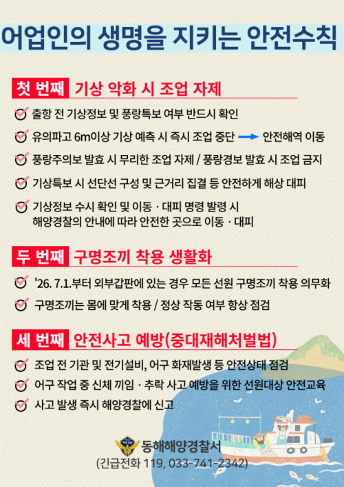 주요 내용은 △출항 전 기상정보 및 풍랑특보 여부 확인 △기상 악화 전 조업 자제 및 안전해역 이동 △기상특보 시 선단선 구성 및 근거리 집결 등 해상 대피 요령 △2026년 7월 1일부터 시행되는 외부갑판 全 선원 구명조끼 착용 의무화 등이다.