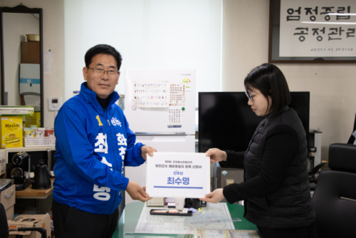 ◇6.3 지방선거 화천군수 선거에 출마하는 더불어민주당 최수명 전 화천부군수가 지난 22일 화천군선거관리위원회에 예비후보 등록서류를 제출하고 본격적인 선거전에 돌입했다.