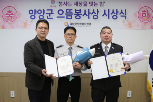 양양군자원봉사센터는 24일 센터에서 1분기 으뜸봉사상 시상식을 열고 개인 부문에 우제명(서면자율방범대)씨와 단체 부문에 현북자율방범대(대장:김석민)를 각각 선정해 시상했다.