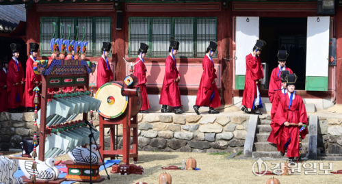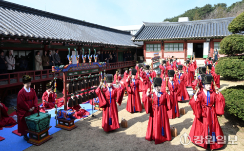 공자를 비롯한 유학 성현들의 학덕을 기리는 ‘2026(공기(孔紀) 2577년) 춘기 석전대제’가 24일 강릉향교 대성전에서 열려 유교 제례의 전통 예악인 문묘제례악과 일무 공연이 펼쳐지고 있다. 이날 제례는 초헌관을 맡은 최상은 강릉향교 교육원장 및 강릉향교 유림과 지역 인사들이 참석한 가운데 봉행됐다. 강릉=권태명기자