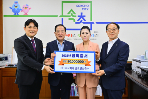 주식회사 글로벌심층수(대표:김진규)는 25일 속초시청을 방문, 지역인재 육성 지원을 위한 장학금 2,000만 원을 기탁했다. 기탁된 장학금은 속초시와 속초해양산업단지협의회에서 추천한 5명의 학생에게 1인당 400만 원씩 지원될 예정이다.