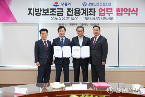 강릉시와 강릉신협은 27일 시청 8층 시민사랑방에서 김홍규 강릉시장, 김남철 강릉신협 이사장, 이상혁 관동신렵 이사장, 황상명 동인병원신협 이사장을 비롯한 신협 임원진 등이 참석한 가운데 지방보조금 전용계좌 업무협약을 체결했다.