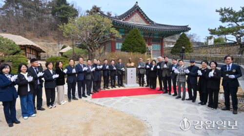 29일 춘천 김유정문학촌에서 열린 ‘김유정 선생 제89주기 추모제’에 참석한 육동한 춘천시장, 김영래 강원일보 전무이사, 전상국 소설가(김유정문학촌 초대 촌장), 박종훈 춘천문화재단 이사장 등 내빈들이 김유정 생가에 새롭게 설치된 김유정 흉상 제막식을 거행하고 있다. 임도혁기자