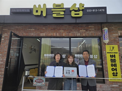 원주시 태장2동지역사회보장협의체(공동위원장:김영자·오원택)는 지난 27일 태장2동행정복지센터에서 미용서비스 업체 버블샵(대표:허보애)과 나눔동행 업무협약식을 진행했다.