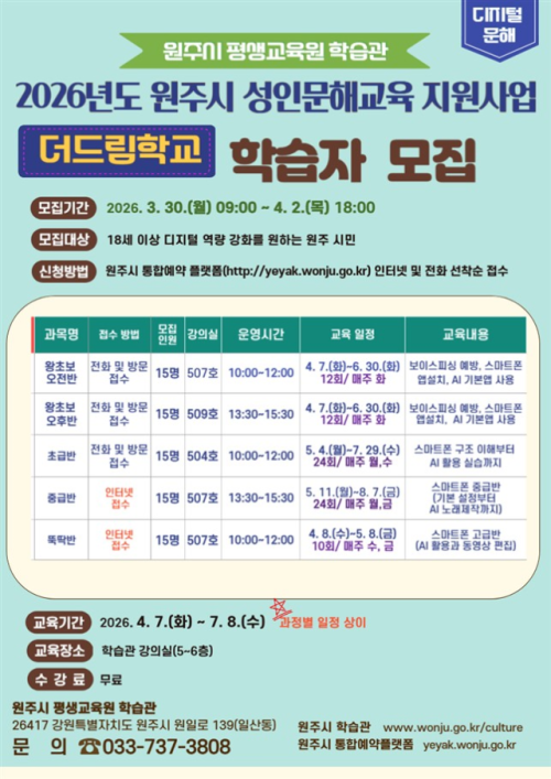 【원주】원주시 평생교육원 학습관은 시민의 디지털 활용 역량 향상과 정보 격차 해소를 위해 ‘2026 더드림학교 더터치반’을 확대 운영한다고 30일 밝혔다.
