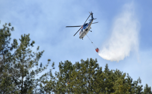 ◇지난 2023년 3월 화천읍 중리 일대에서 발생한 산불 현장에서 화천군 임차헬기가 진화에 나서고 있다. 사진제공=화천군