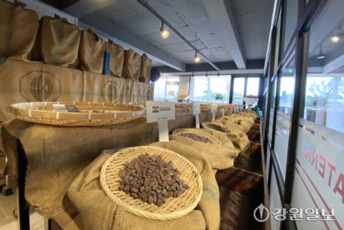 ◇현지에서 공수해온 카카오 빈이 보나테라 초콜릿 제조장에 진열돼 있다.