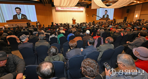 ‘제15회 수산인의 날’ 강원도 행사가 31일 강릉 라카이 샌드파인에서 열려 김진태 강원특별자치도지사가 “어업용 면세유 관련 정부 지원 70%에 더해 지방 예비비 30%를 지원하고, 수산물 가격 지지 수매 사업을 늘리며 불법 해루질이 근절되도록 단속을 강화하겠다"고 밝히고 있다. 강릉=권태명기자