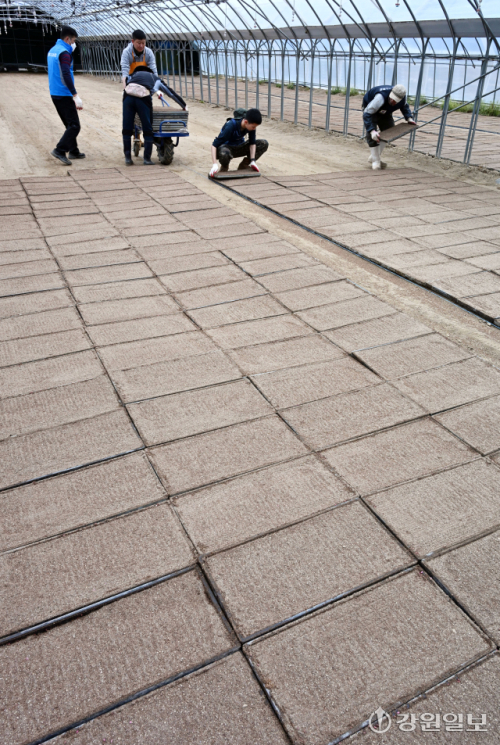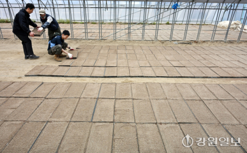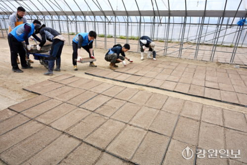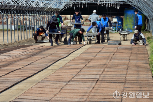 따뜻한 봄이 찾아오면서 한해 농사의 시작점인 못자리 설치가 한창이다. 지난 31일 양구군 죽리의 한 농가에서 양구군농협 직원들과 21사단 장병들이 못자리를 설치하며 농촌일손돕기를 하고 있다. 못자리는 벼를 논에 심기 전에 모판에 볍씨를 뿌려 일정 기간동안 모를 기르는 작업을 말한다. 양구=신세희기자