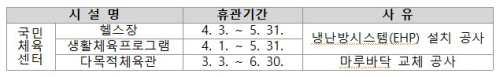 헬스장은 냉난방시스템 EHP 설치 공사로 3일부터 5월 31일까지, 생활체육프로그램은 냉난방시스템 EHP 설치 공사로 1일부터 5월 31일까지, 다목적체육관은 앞서 3월 3일부터 6월 30일까지 마루바닥 전면 교체 공사를 벌인다.)